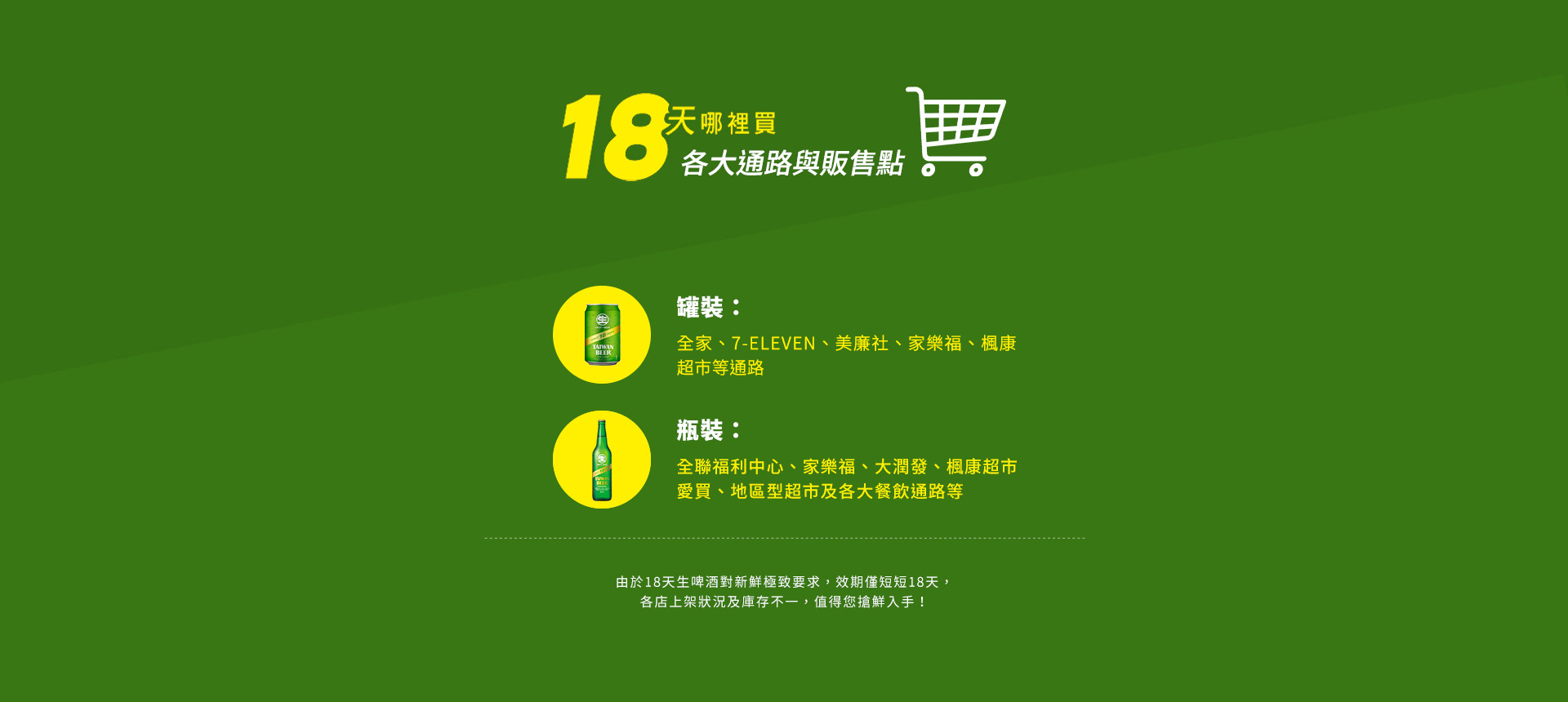 18天台灣生啤酒未經過巴氏德殺菌,採用歐洲優質原料,全程0-7°C冷藏保鮮,猶如鮮奶與生魚片般珍貴,保留最多啤酒營養及麥香風味;這樣高品質、超新鮮、賞味期只有18天的台灣生啤酒,值得您搶鮮到手!